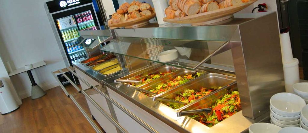 450 Personen Neukonzeptionierung der Speisenausgabe im Betriebsrestaurant. Hochwertiger Officelunch mit Salat, Fleisch, Vegan und Vegetarisch. Personal und Ausstattung.